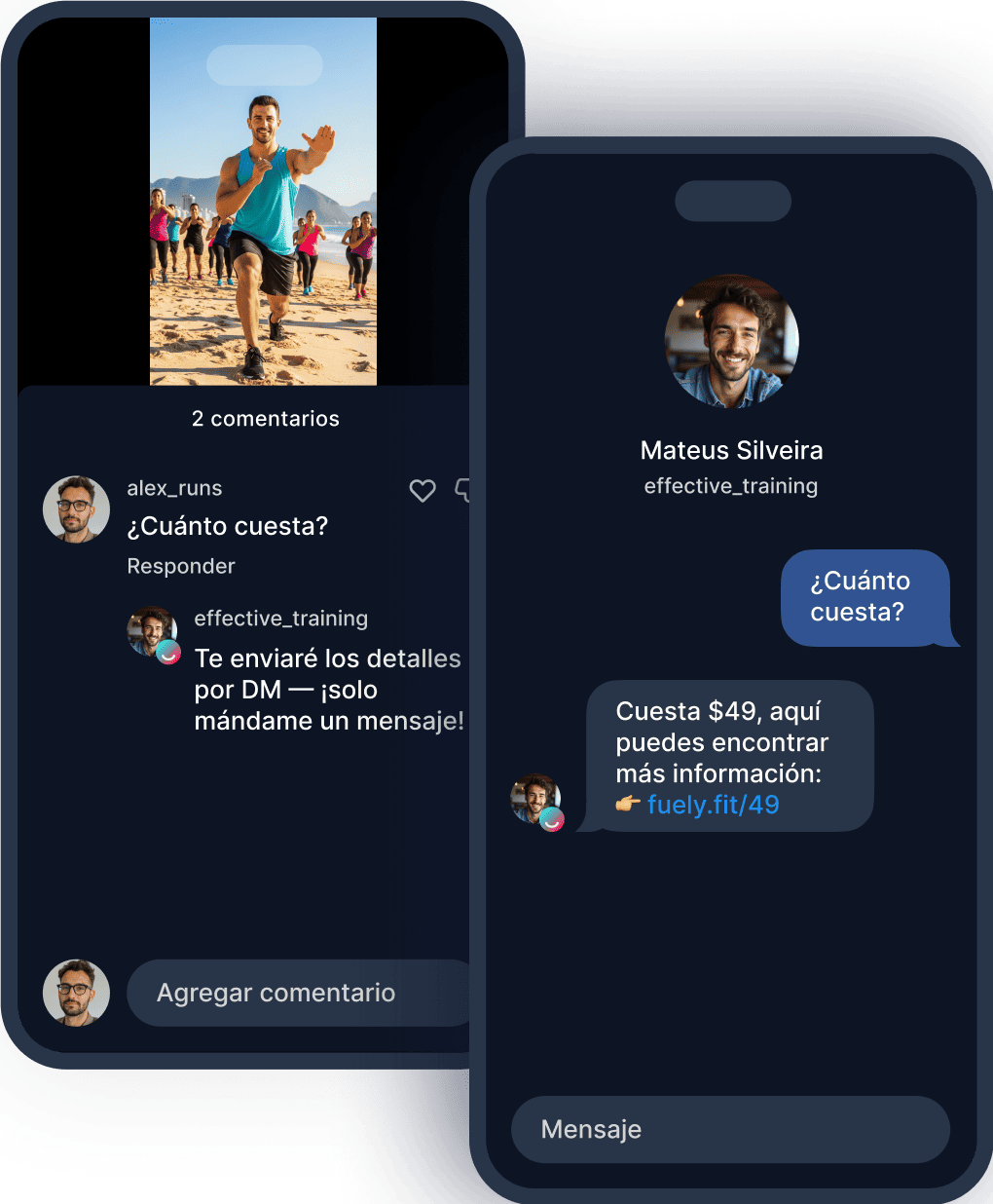 Un usuario comenta: “¿Cuánto cuesta?” — Fuely IA responde: “Te envío los detalles por DM — solo mándame un mensaje!”.